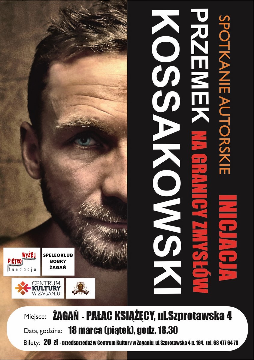 To kolejna odsłona SPOTKAŃ Z PODRÓŻNIKAMI I LUDŹMI GÓR organizowanych przez Fundację Piętro Wyżej, Speleoklub Bobry Żagań, Centrum Kultury i Pałac Książęcy. Więcej info tu: http://centrumkultury.zagan.pl/inicjacja-na-granicy-zmyslow-z-przemkiem-kossakowskim/