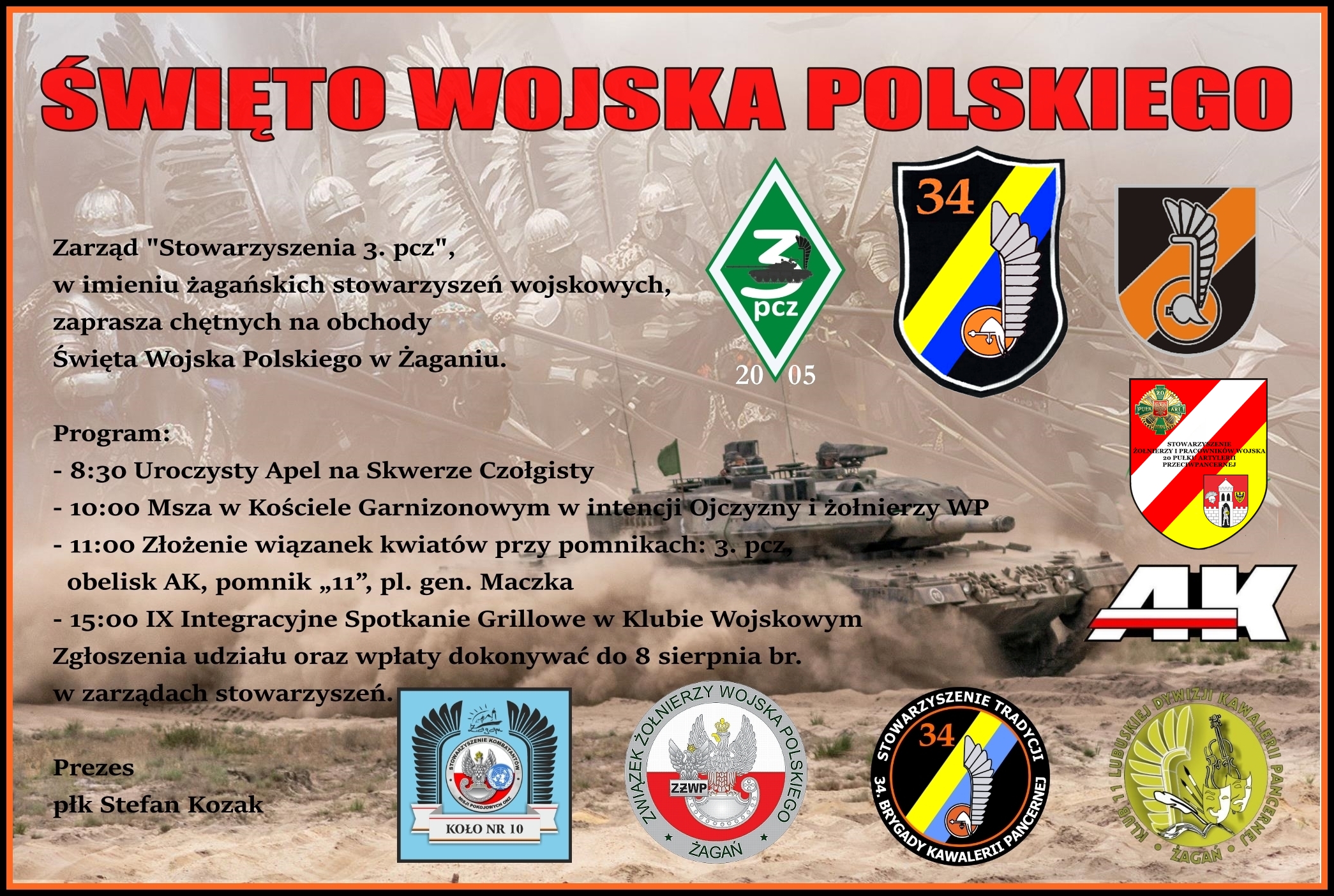 Obchody Święta Wojska Polskiego zorganizowane zostały przez dowódcę 34. Brygady Kawalerii Pancernej im. Hetmana Wielkiego Koronnego Jana Saryusza Zamoyskiego płk. Jerzego Biryłko, który reprezentował gen. dyw. Piotra Fajkowskiego - dowódcę 11. Lubuskiej Dywizji Kawalerii Pancernej im. Króla Jana III Sobieskiego. Wzięły w nich udział żagańskie stowarzyszenia wojskowe: Stowarzyszenie Żołnierzy i Pracowników Wojska 3. Drezdeńskiego Pułku Czołgów Średnich im. 3. Brygady Pancernej, Koło nr 3 Związku Żołnierzy WP (ZŻWP), Koło nr 10 Stowarzyszenia Kombatantów Misji Pokojowych ONZ, Stowarzyszenie Żołnierzy i Pracowników Wojska 20. Pułku Artylerii Przeciwpancernej, Stowarzyszenie Tradycji 34. Brygady Kawalerii Pancernej, Federacja Organizacji Polskich Pancerniaków (FOPP) i żagańskie Koło Światowego Związku Żołnierzy AK (ŚZŻAK).