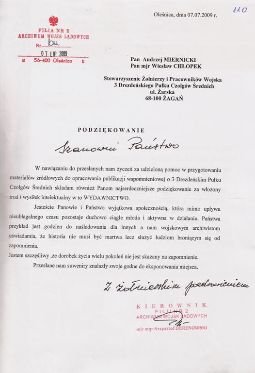 Po 5 latach dziękujemy koleżankom i kolegom za ich wspomnienia, które utrwaliły i udokumentowały pozytywny obraz pułku. Dziękujemy również osobom (przyjaciołom i sympatykom) i instytucjom, które udzieliły nam wszechstronnej pomocy i wsparcia. Osobne podziękowania kierujemy pod adresem ówczesnego kierownika Archiwum Wojsk Lądowych w Oleśnicy, mjr. mgr. Krzysztofa Derenowskiego za stworzenie warunków, w jakich mogliśmy robić kwerendę dokumentów i wybierać najciekawsze informacje, aby później zaprezentować je w książce. To one pomogły nam zatrzymać tamte, wspaniałe młode lata służby i pracy.
