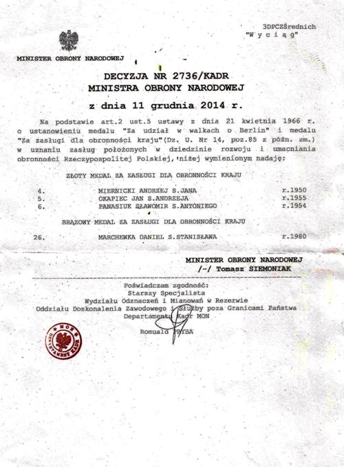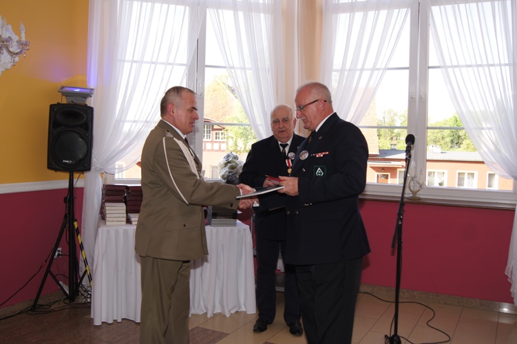 Mija 10 lat od powstania Stowarzyszenia Żołnierzy i Pracowników Wojska 3. Drezdeńskiego Pułku Czołgów Średnich. Z tej okazji w dniu dzisiejszym, 8 maja 2015 r., odbył sie VI Zjazd naszego stowarzyszenia. Rozpoczął się od złożenia kwiatów pod Pamiątkową Tablicą w Kościele Garnizonowym i przy naszym pomniku na Pl. im. 3. Drezdeńskiego Pułku Czołgów Średnich. Następnie wszyscy się udali do kościoła pw. Wniebowzięcia Najświętszej Marii Panny gdzie ksiądz prałat Eugeniusz Jankowski odprawił Mszę Świętą która rozpoczęła obchody 70. rocznicy zakończenia II Wojny Światowej w Europie. Po mszy uczestnicy przeszli na Placu Generała Maczka w asyście kompanii honorowej i orkiestry wojskowej, gdzie przeprowadzony został uroczysty apel. Po przemówieniach odczytano rozkazy o awansach i wyróżnieniach. Na wniosek Stowarzyszenia 3. pcz minister Obrony Narodowej Decyzją nr 2736/Kadr z dnia 11 grudnia 2014 r. nadał ZŁOTY MEDAL ZA ZASŁUGI DLA OBRONNOŚCI KRAJU dla: Andrzeja Miernickiego, Jana Okapca, Sławomira Panasiuka, BRĄZOWY MEDAL ZA ZASŁUGI DLA OBRONNOŚCI KRAJU dla Daniela Marchewki. Na zakończenie por. Krzysztof Jędrys odczytał Apel Pamięci a kompania honorowa z batalionu dowodzenia oddała salwę honorową. Kolejnym punktem było spotkanie w Pałacu Książęcym. W tym czasie uczestnicy zjazdu złożyli kwiaty przy pomniku ŻOŁNIERZY I PRACOWNIKÓW WOJSKA ŻAGAŃSKICH JEDNOSTEK WP na Cmentarzu Komunalnym. O godz. 14 30 rozpoczęło sie w Hotelu Willa Park Walne Zebranie które przyjęło plan pracy na następne dwa lata. Przyjęto stosowne uchwały które weszły do realizacji z dniem przyjęcia. Prezes płk rez. Stefan Kozak wyróżnił następujących członków: Adamowicz Jerzy, Fajger Janina, Grygorcewicz Antoni, KowalskI Lesław, Okapiec Halina i Jan, Panasiuk Sławomir, Pindral Jan, Rzepka Jan, Szmagier Tadeusz, Pożerski Edward. W dalszej części zjazdu b. dowódca 3. pułku czołgów, płk Marian Kapała, wręczył medal Sławomirowi Panasiukowi a prezes podziękował naszym przyjaciołom i członkom za współpracę wręczając wszystkim pamiątki stowarzyszenia. Szczególne podziękowania skierował do: płk. w st. spocz. Eugeniusza Praczuka, wydawcy naszego albumu Jana Sosnowskiego z Oficyny Wydawniczej DEKORGRAF, ppłk. Dariusza Lesiuka, ppłk. Zbigniewa Łukasiewicza, ks. mjr. Władysława Jasicy, Państwa Haliny i Jana Okapiec, Jerzego Adamowicza oraz prezesów stowarzyszeń - ppłk. rez. Krzysztofa Polusika, mjr. rez. Henryka Boreckiego i ppłk. rez. Mieczysława Kupczyka. We wszystkich kolejnych elementach dzisiejszych uroczystości brali udział nasi członkowie którzy zjechali z całej Polski. Wszystkich uczestników VI Zjazdu było 95 osób - pięć osób złożyło deklarację przyjęcia w poczet członków stowarzyszenia. Poczet sztandarowy stowarzyszenia występował w składzie: Antoni Grygorcewicz, Tadeusz Szmagier i Edward Pożerski. Należy dodać, że nasza Oferta Zadania Publicznego 414 001 została rozpatrzona pozytywnie przez Departament Komunikacji Społecznej MON i uzyskaliśmy wsparcie finansowe na współorganizowanie 70. rocznicy zakończenia II Wojny Światowej. Wspaniałe szampańskie spotkanie przy muzyce zakończyło obchody 10. rocznicy powstania Stowarzyszenia 3. pcz.