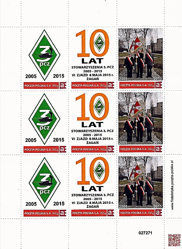 Mija 10 lat od powstania Stowarzyszenia Żołnierzy i Pracowników Wojska 3. Drezdeńskiego Pułku Czołgów Średnich. Miniony okres był dla nas bardzo udany. Każdego roku organizowaliśmy uroczystości poświęcone pamięci o koleżankach i kolegach oraz o naszej jednostce w której spędziliśmy nasze najmłodsze lata służąc naszej Ojczyźnie - Rzeczypospolitej Polskiej. Dla uczczenia okrągłej rocznicy Poczta Polska wydała znaczek okolicznościowy który jest naszą własnością i może być dowolnie wykorzystany. Służy do potwierdzenia opłacenia usługi pocztowej świadczonej przez Pocztę Polską S.A., zawiera informacje umożliwiające identyfikację operatora pocztowego oraz informację o wysokości opłaty za usługę pocztową wyrażoną w formie cyfr arabskich lub liter alfabetu łacińskiego bądź poprzez odniesienie do masy i kategorii przesyłki pocztowej oraz posiada nadrukowany, przekazany przez "Stowarzyszenie 3. pcz", projekt graficzny którego autorem jest Andrzej MIERNICKI - sekretarz stowarzyszenia. Wartość nominalna jednego znaku opłaty pocztowej odpowiada opłacie za przesyłkę listową, nierejestrowaną, ekonomiczną w obrocie krajowym - gabaryt „A” do 350 g . Jeden arkusz zawiera 9 zadrukowanych znaków opłaty pocztowej na których umieszczono trzy wzory w tz. bloku. Wymiary znaczka okolicznościowego to: 38 mm x 44 mm. Zadruk w pełnym kolorze. Arkusze kolejno ponumerowane. Znaczek wraz z wydaną kopertą okolicznościową, oprawione w formie "tablo", będą wspaniałą pamiątką naszych rocznicowych uroczystości dla naszych koleżanek i kolegów.